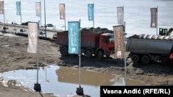 Kamioni dovoze materijal i odvoze zemlju, a bageri je iskopavaju i poravnavaju. Obližnjom biciklističkom stazom, kojom je kretanje dozvoljeno, u šetnji je Mirko Lakatoš.