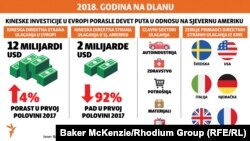 Najavljene kineske investicije u prvoj polovini 2018. gostigle su 22 milijarde američkih dolara u Evropi, a samo 2,5 u sjevernoj Americi. Istovremeno, dovršene kineske investicije u Evropi u prvoj polovini ove godine dostigle su 12 milijardi dolara, što je za 4 posto više nego u istom periodu prošle godine. S druge strane, ulaganja prema Sjevernoj Americi smanjena su za 92 posto, na 2 milijarde dolara, navodi se u istraživanju londonske tvrtke Baker McKenzie i američkih analitičara iz Rhodium Groupe.