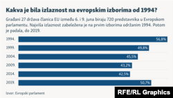 Na prvim evropskim izborima 1979. kada je tadašnja Evropska zajednica imala devet država članica, glasalo je 61,9 odsto, da bi na izborima 2014. godine to palo na samo 42,61 odsto.