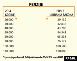 „Primera radi, penzija koja je u oktobru 2014. godine iznosila 50 000 dinara (oko 420 evra), nakon stavljanja zakona van snage iznosiće 53.954 dinara (oko 450 evra).“