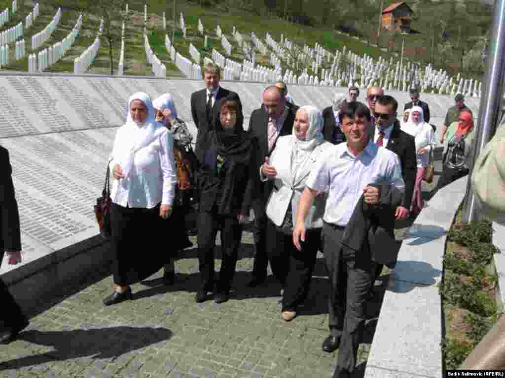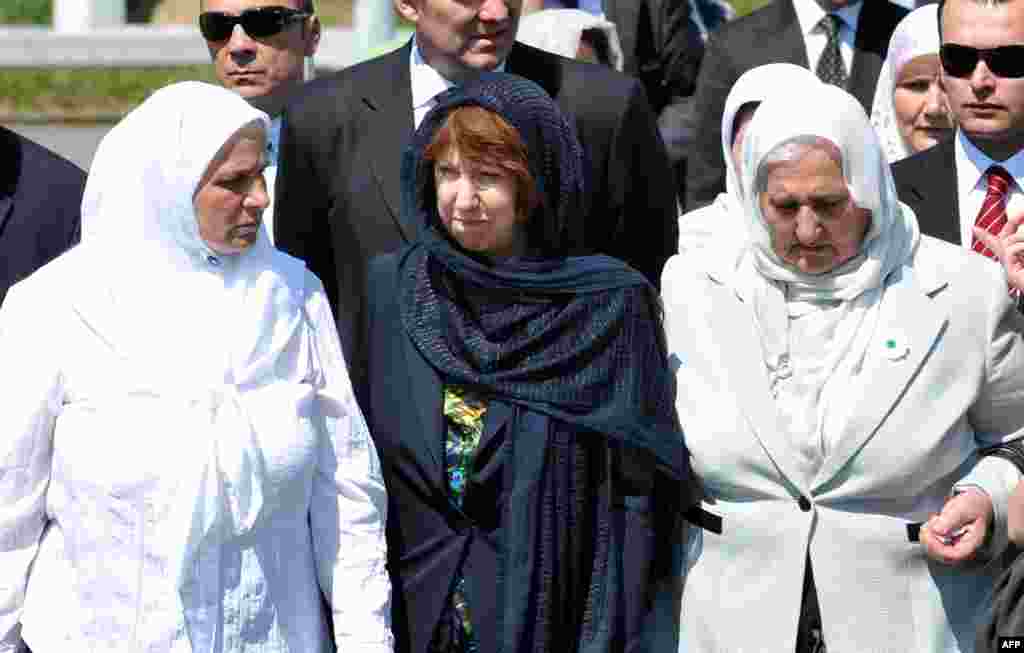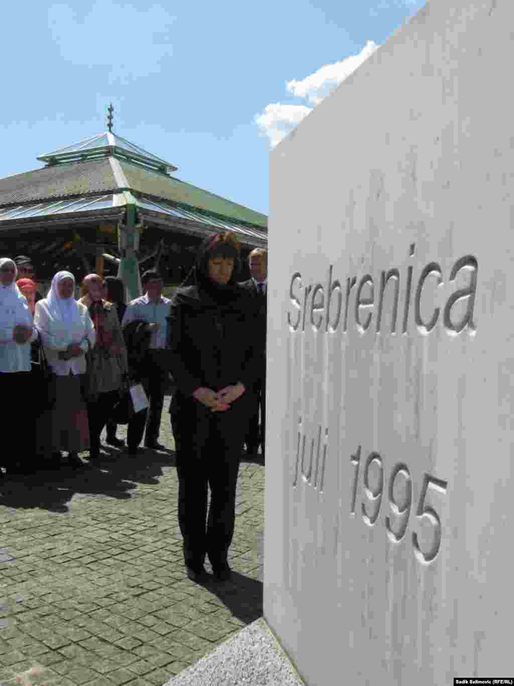 Visoka predstavnica EU za vanjsku politiku i sigurnost Catherine Ashton u Memorijalnom centru Potočari položila je cvijeće na spomen obilježje i odala poštu Bošnjacima ubijenim u genocidu jula 1995. godine. Foto, Sadik Salimović i agencije