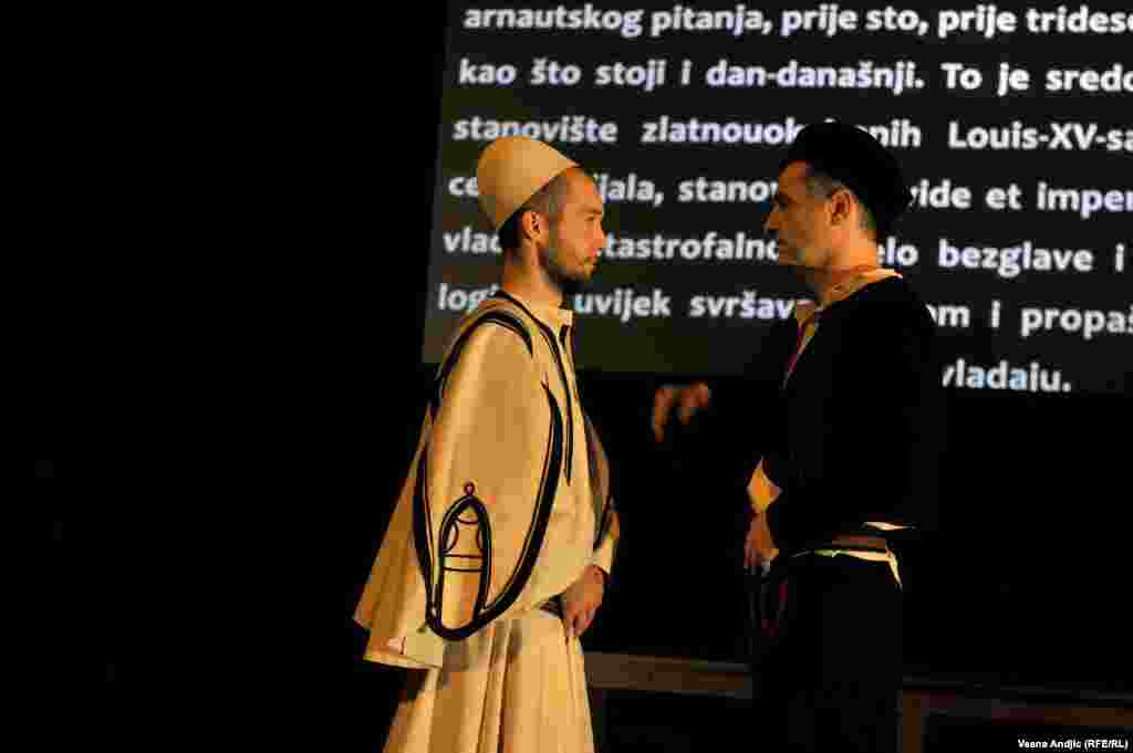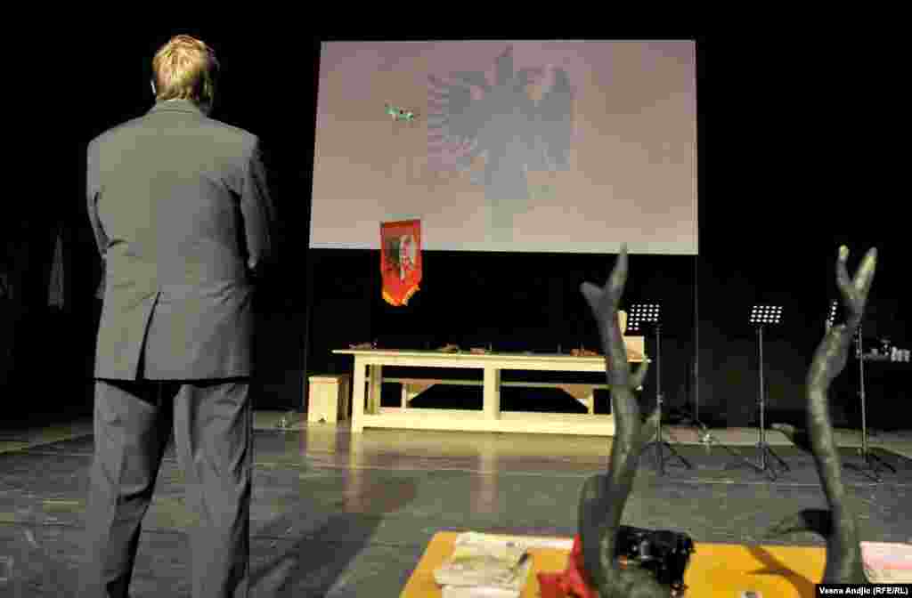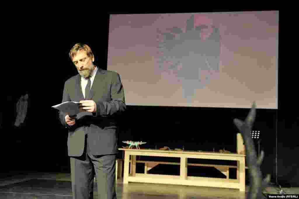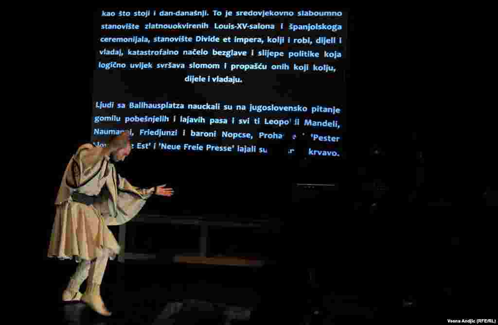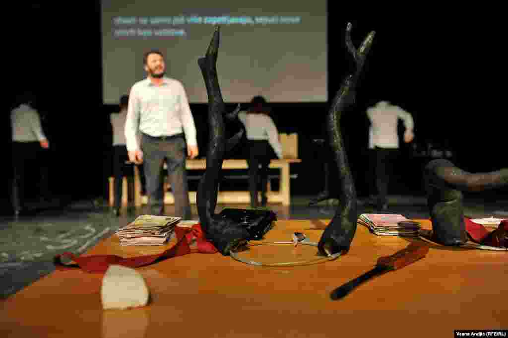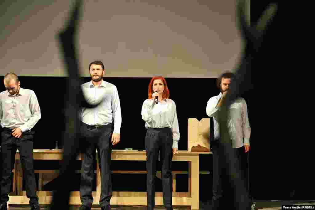 U prepunoj sali Centra za kulturnu dekontaminaciju izvedena je predstava "Enciklopedija živih". "Enciklopedija živih" je srpsko-albanski, kosovsko-srbijanski pozorišni leksikon u kome se stvari i lica nazivaju onako kako jesu. Njen osnovni nauk jeste da nacionalna, nacionalistička elita sirotinji diluje hašiš nacionalizma da bi se ta srpsko-albanska sirotinja međusobno istrebljivala, a da bi elita, sa obe strane izvlačila profit i utvrđivala svoju moć. RSE FOTO: Vesna Anđić