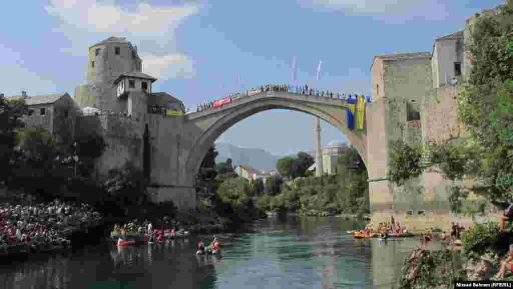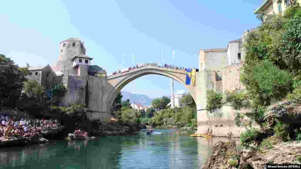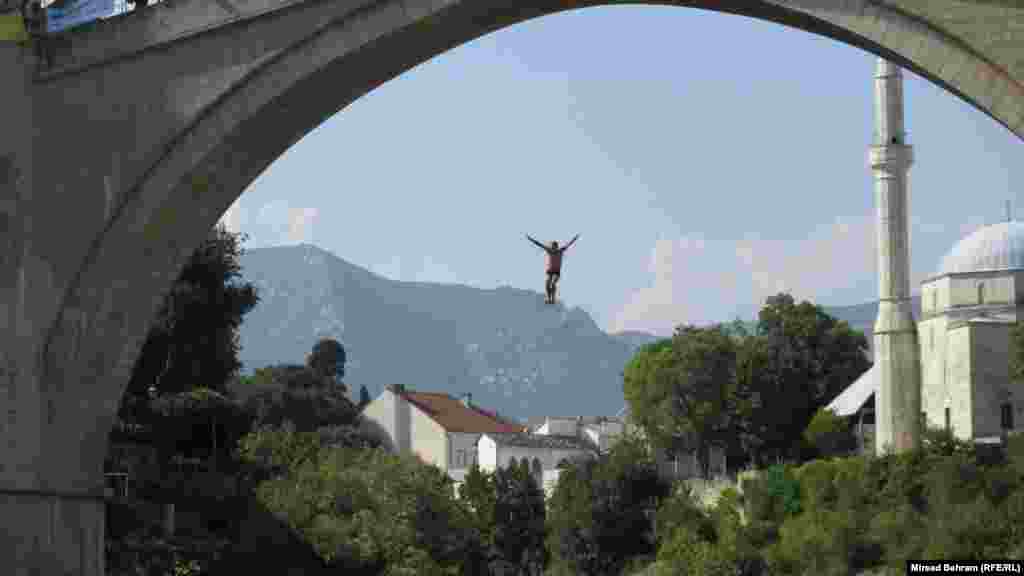Mostarac Lorens Listo po deveti put je pobijedio u skokovima sa Starog mosta u Neretvu. U konkurenciji od 30 skakača, u popularnijoj i opasnijoj disciplini skokova na glavu, poznatijoj kao „mostarska lasta“, Listo je u dvije serije dobio po pet desetki stručnog žirija i time odnio još jednu pobjedu. RSE/FOTO: Mirsad Behram