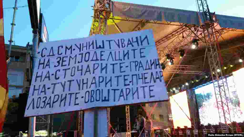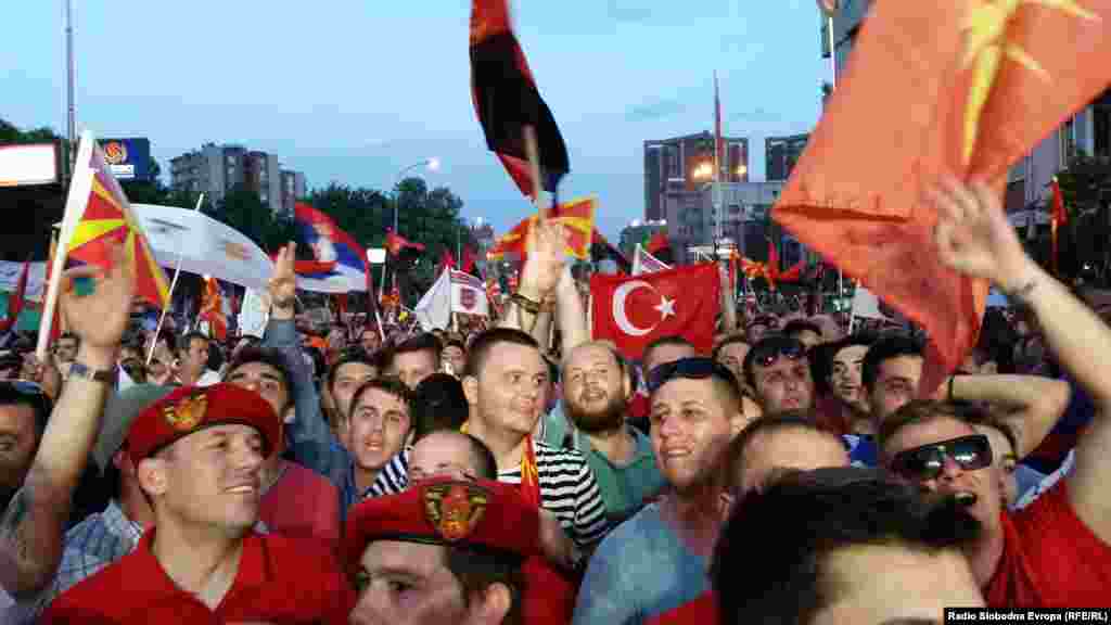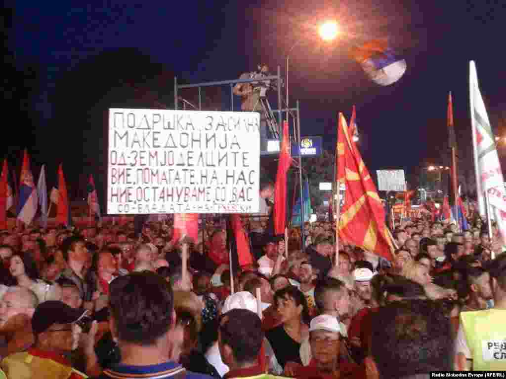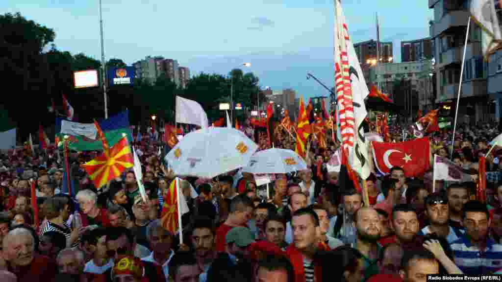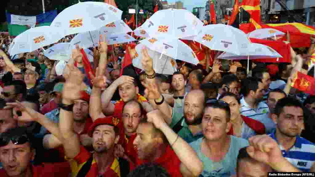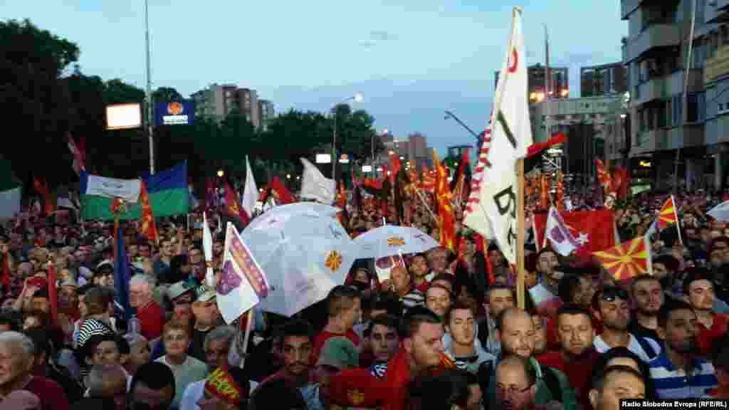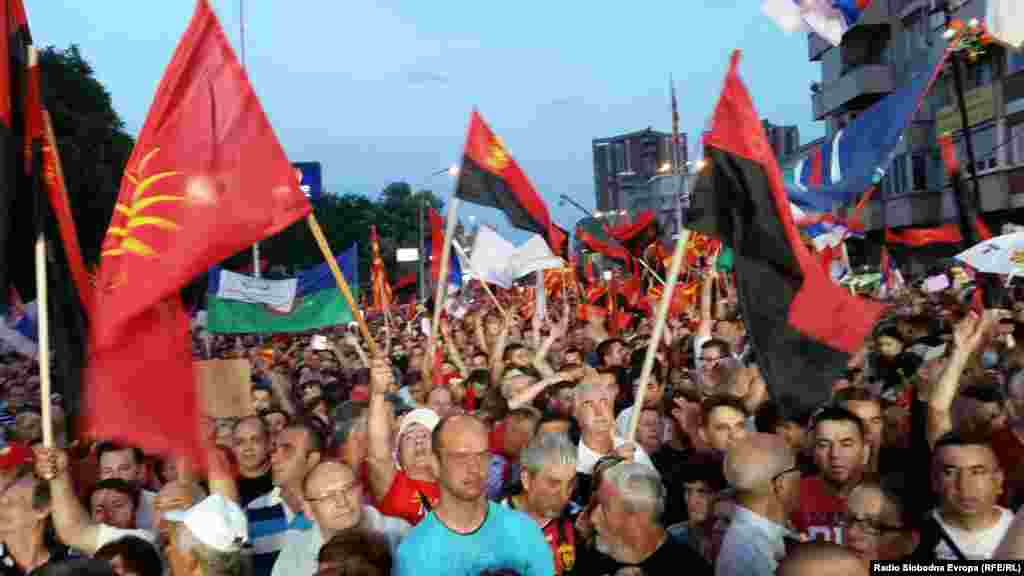 Miting u organizaciji vladajuće VMNO DPMNE zvanično je počeo u centru Skoplja nešto posle 20 časova. Kako prenose mediji, ispred zgrade Sobranja se okupilo oko 20.000 ljudi, u masi se vijore zastave Makedonije. Na jednom transparentu piše "No USA". Skup pod parolom "Snažna Makedonija" organizovala je vladajuća VMRO DPMNE i partije iz vladajuće koalicije. Centar grada je bio blokiran još od jutarnjih sati. FOTO: RSE/Makedonski servis