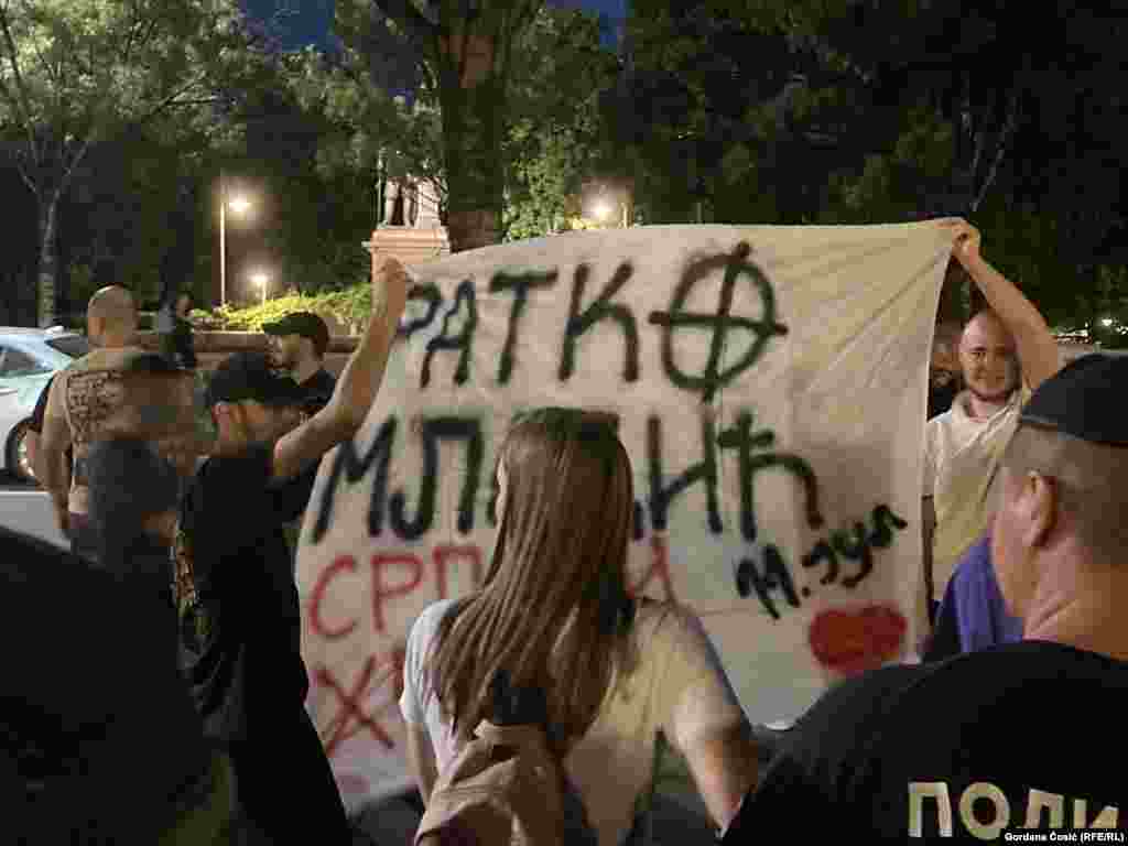 Ekstremni desničari nosili su transparente koji slave Ratka Mladića, komandanta Vojske Republike Srpske, koji je osuđen na doživotnu kaznu za genocid u Srebrenici.