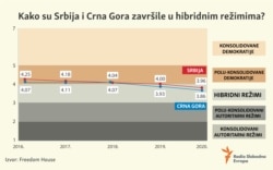 Na tradicionalnoj godišnjoj listi, nakon analize stanja, Fridom Haus vratio je ove dve države Zapadnog Balkana korak unazad, u grupu tranzicionih odnosno, “hibridnih režima”.