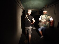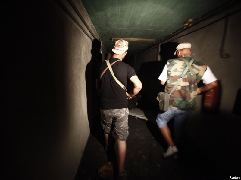 Pobunjenici šetnja kroz tunel u Gadafijevom porušenom skrovištu Bab al-Aziziiau, Tripoli, 26. avgust 2011.