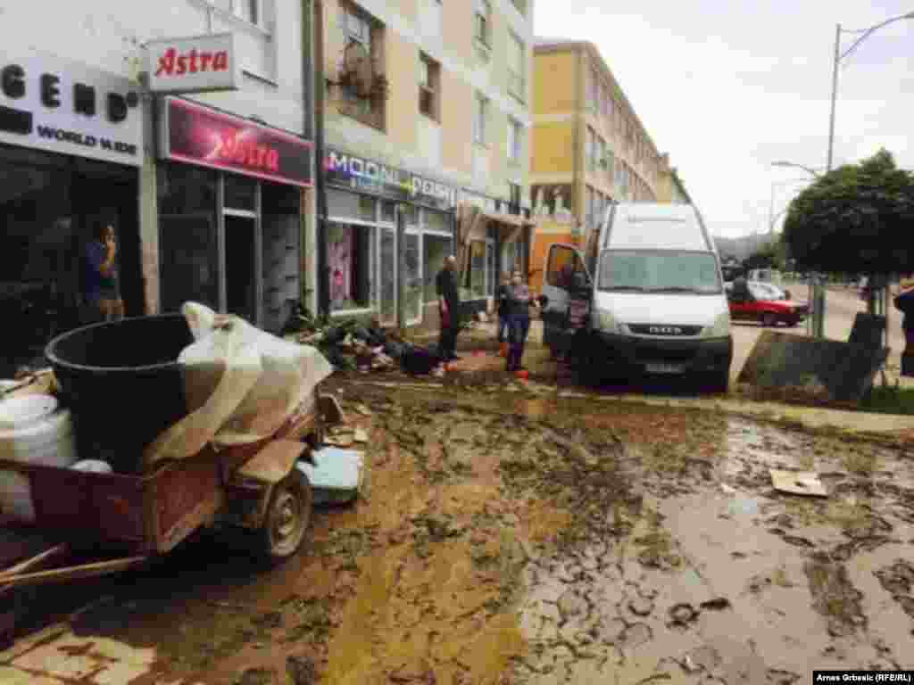 Voda se doprema cisternama. Tragovi katastrofe vidljivi su na svakom koraku. Građani hodaju sa zaštitnim maskama zbog zraka punog prašine i neprijatnih mirisa. U glavnoj gradskoj ulici i drugim dijelovima grada i dalje se mogu vidjeti ogromne količine blata i hrpe namještaja. Na ulici su i sudski predmeti. 20.5.2014. I u Tešnju slike nakon katastrofe nimalo lijepe. RSEFoto / Arnes Grbešić