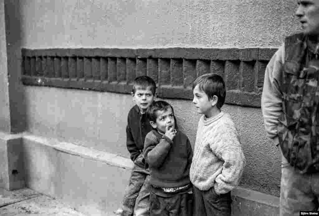 Djeca izbjeglice iz Bosne i Hercegovine u izbjegličkom kampu u Varaždinu, Hrvatska, u zimu 1992. godine. Dječak lijevo je (vjerovatno mu je to ime) Elvis.