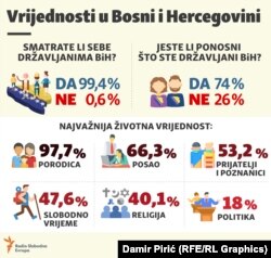 "Na pitanje da li građani smatraju sebe državljanima Bosne i Hercegovine, 99,4 posto ispitanih je izjavilo da su državljani BiH, u odnosu na šest posto koji su izjavili da nisu. Ovaj trend imamo po svim varijablama, po polu, generaciji kojoj pripadaju, stupnju obrazovanja i administrativnoj podjeli BiH. Na pitanje, na koji način se iskazuje afilijativni stav prema državi, odnosno koliko smo ponosni na pripadanje državi u kojoj živimo, 74 posto građana i građanki na ukupnom uzorku izjavilo je da su veoma ponosni što su državljani BiH, 26 posto ispitanika izjavilo je da nisu ponosni što su državljani ove zemlje", ističe profesorica Kolenović-Đapo.