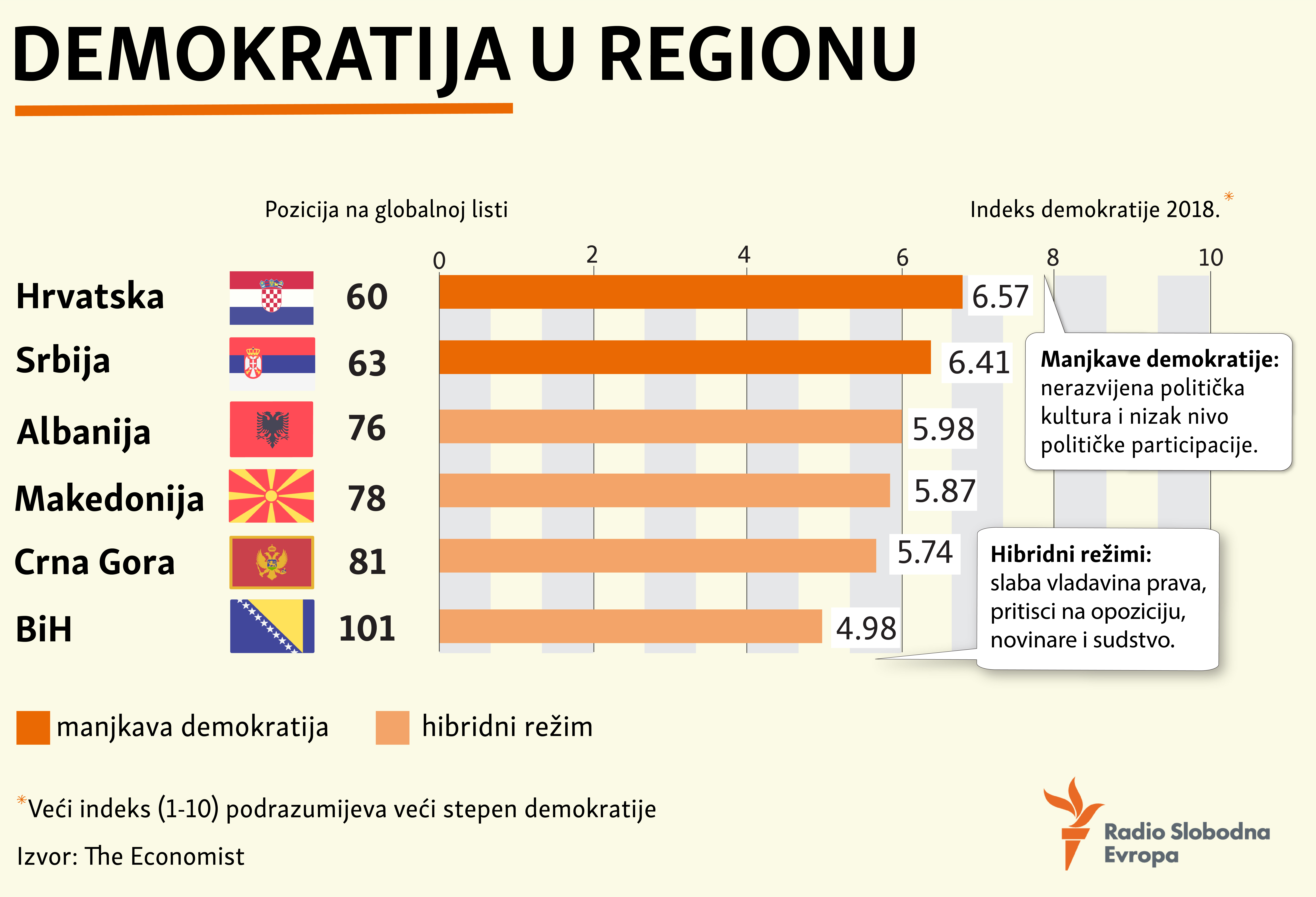 Norveška je godinama prvorangirana zemlja na globalnoj listi Indeksa demokratije koju objavljuje list The Economist. A kako se od ukupno 167 zemalja svijeta kotiraju države regiona?