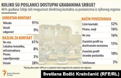 Međutim, istraživanje NDI-a pokazuje da 91 odsto ispitanika nikada nije imalo kontakt ni sa jednim poslanikom a svega dva odsto da takve susrete ima par puta u godini. Čak i kada do kontakata i dođe, oni se uspostavljaju, pokazuje istraživanje, putem ličnih veza i poznanstava a mnogo ređe zvaničnim putem – mejlom, pismom ili telefonom.