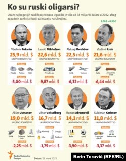 To je mala promjena u poređenju sa zajedničkim bogatstvom od 310 milijardi dolara od 46 sankcioniranih milijardera iz Rusije na Forbsovoj listi svjetskih milijardera za 2023. godinu.