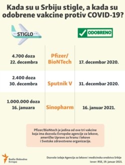 Vakcina kompanija Pfizer/BioNTech jedina je stigla u Srbiju nakon provere i dobijanja dozvole Agencije za lekove i medicinska sredstva Srbije (ALIMS). Sputnjik V je stigla u Srbiju a da nije imala dozvolu, koju je dobila dan kasnije. Milion doza kineske vakcine je stiglo u Srbiju u subotu 16.1.2021. da bi istog dana dobila i dozvolu ALIMS-a.