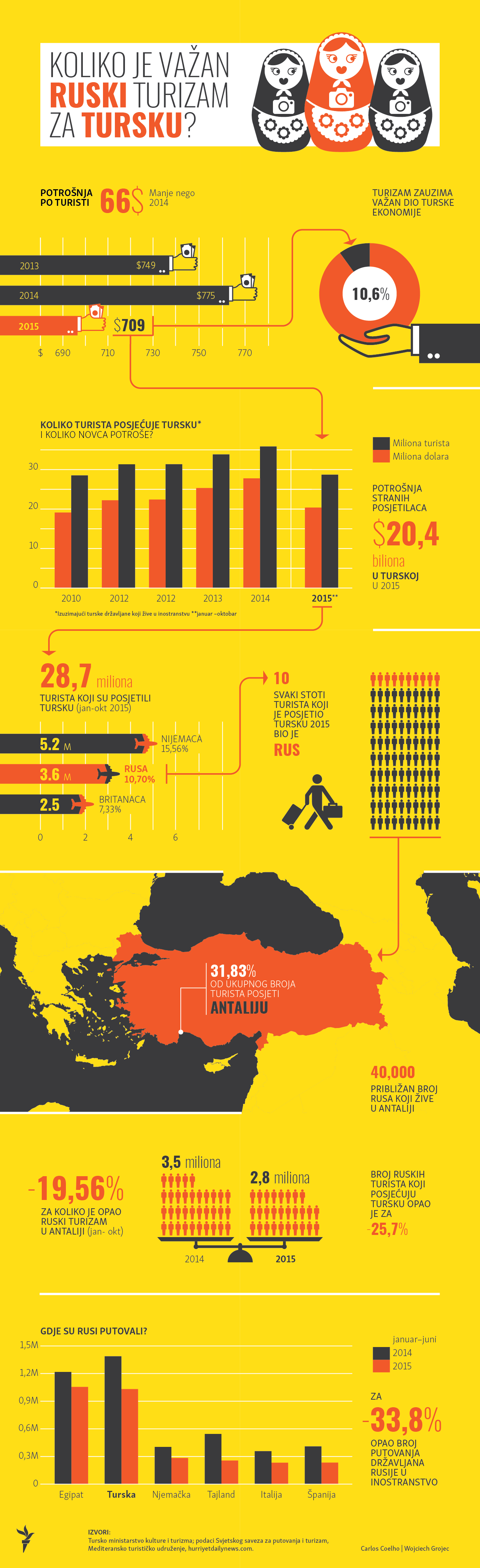 Turska je bila jedna od omiljenih turističkih destinacija državljana Rusije. Svaki stoti turista u ovoj zemlji bio je Rus. Međutim nakon obaranja ruskog aviona i zahlađenja odnosa između dvije države, broj njihovih putovanja u Tursku je opao za 25 odsto.