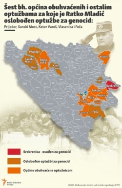 Potvrđena je presuda Sudskog vijeća ICTY iz 2017. kojom je Mladić oslobođen optužbe za genocid počinjen u šest bosanskohercegovačkih opština tokom 1992. godine – Prijedoru, Sanskom Mostu, Ključu, Kotor Varoši, Foči i Vlasenici.