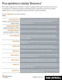 Među optuženima su Bratislav Nikolić, bivši predsednik Opštine Štrpce iz Srpske liste, gde se nalazi Brezovica, zatim direktori opštinskih direktorijata, službenici Ministarstva životne sredine, građevinski preduzetnici i druga lica koja su pomagala ili davala mito u zamenu za građevinske dozvole.