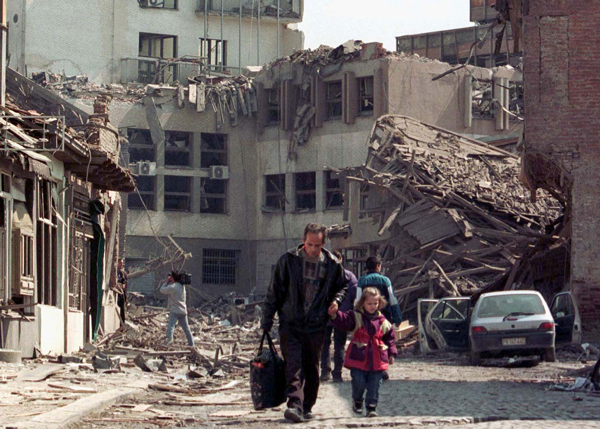 Otac i kćerka prolaze pored uništenih kuća nakon što je NATO projektil pogodio centar kosovske prijestolnice Prištine 7. aprila.