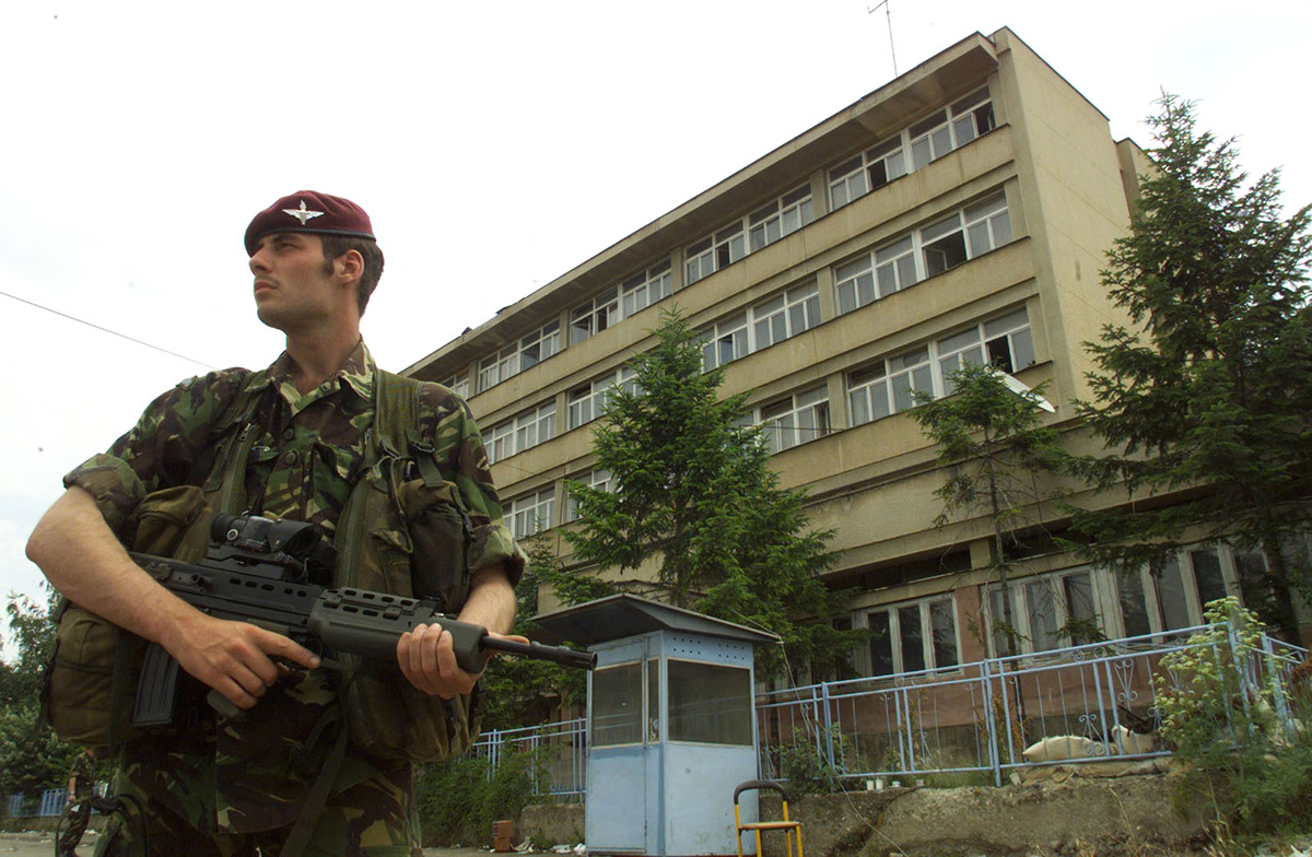Pripadnik britanske padobranske jedinice stoji na straži ispred srpske policijske stanice u Prištini. (AP Photo /Russell Boyce/Pool)
