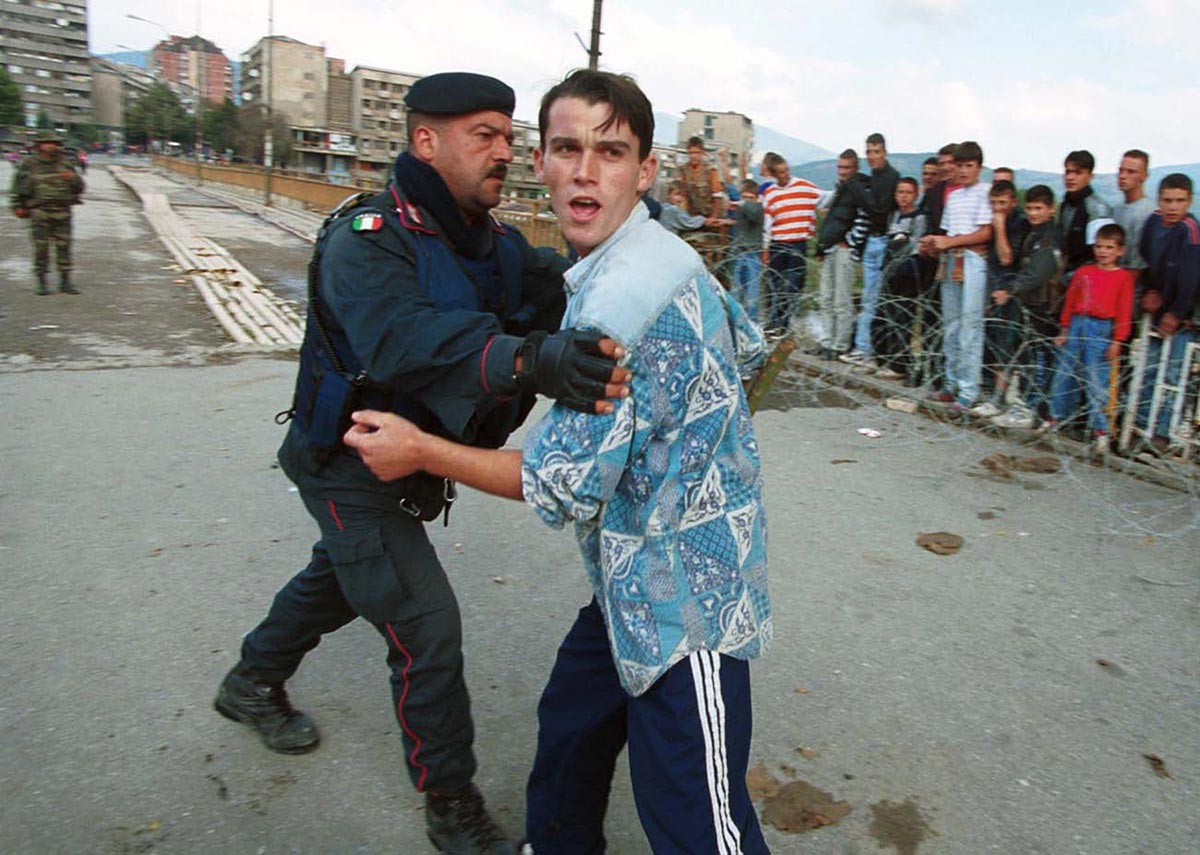 Italijanski pripadnik specijalne policije KFOR-a spriječava albanskog demonstranta da pređe preko mosta da bi se sukobio sa Srbima u Mitrovici, kosovskom gradu na sjeveru. Glavni most u ovom gradu je bio mjesto sukoba između Albanaca i Srba nakon rata na Kosovu. (AP Photo/Jacqueline Larma)