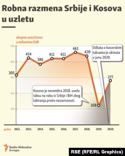 Prošle godine, prema podacima Agencije za statistiku, Kosovo je u Srbiju izvezlo robu u iznosu od 42 miliona evra, u 2020. godini 30 miliona evra, dok je u 2019. godine izvoz bio 27 miliona evra. Ove cifre su znatno manje u odnosu na vrednost uvoza Srbije na Kosovo proteklih godina.