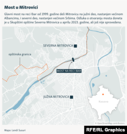 Most na Ibru, koji deli dve opštine sa albanskom i srpskom većinom – Južnu i Severnu Mitrovicu – trenutno je otvoren samo za pešake.