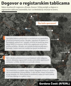 Zvanična primena Sporazuma o registarskim tablicama potpisanog 30. septembra u Briselu počela je 2. oktobra, dok je druga tačka sporazuma, prelepljivanje belim stikerima simbola Kosova i Srbije na registarskim oznakama, počela da se sprovodi u ponedeljak 4. oktobra.
