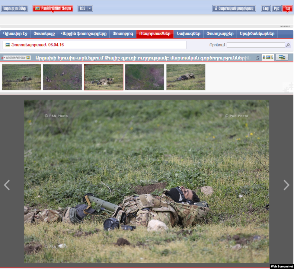 Potpisani autor je Karo Sahakyan, a na fotografiji je telo azerbejdžanskog vojnika koji leži na liniji fronta u Nagorno-Karabahu, otcepljenoj regiji Azerbejdžana.