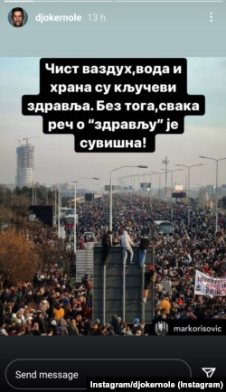 "Čist vazduh, voda i hrana su ključevi zdravlja. Bez toga, svaka reč o 'zdravlju' je suvišna", stoji u Đokovićevoj objavi na Instagramu, koju je ilustrovao fotografijom sa protesta koji su 4. decembra održani u Beogradu i širom Srbije.
