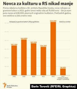 Prema rebalansu budžeta usvojenom 3. novembra u Narodnoj skupštini RS, grantovi za kulturu su smanjeni sa prvobitno planiranih 1,25 miliona maraka(oko 638.000 evra) na samo 150.000 (oko 77.000 evra).