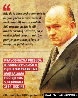 Većina članova Žalbenog vijeća Međunarodnog krivičnog suda za bivšu Jugoslaviju (ICTY) u procesu Stanislavu Galiću je zaključila da je "minobacačka granata koja je prouzrokovala eksploziju ispaljena s područja pod kontrolom Sarajevsko-romanijskog korpusa".