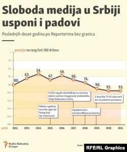 Na listi međunarodne nevladine organizacije Reporteri bez granica (Reporters Sans Frontières) “Indeks medijskih sloboda u svetu”, objavljenoj u aprilu 2020. godine, Srbija je na 93. mestu među 180 rangiranih država.