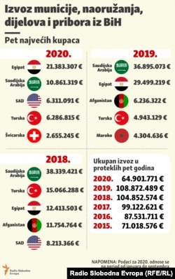 Prema podacima državne Spoljnotrgovinske komore, tokom prošle godine, izvoz namjenske industrije iz BiH, koji se odnosi na oružje, municiju, eksplozive i pirotehničke proizvode, iznosio je 280,7 miliona KM (oko 140 miliona evra).