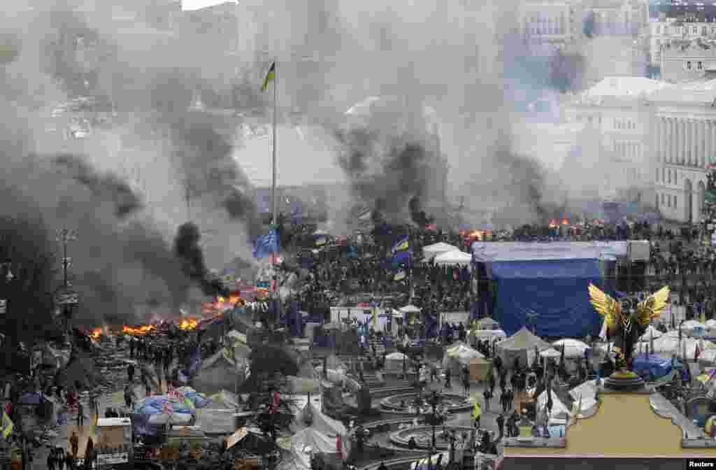 Kijev je poput ratišta osvanuo nakon najkrvavijeg dana u gotovo tri mjeseca koliko traju demonstracije u Ukrajini. Najmanje 25 ljudi poginulo, među kojim devet policajaca, a ranjenih je gotovo 250. Kijev, 19.2.2014.