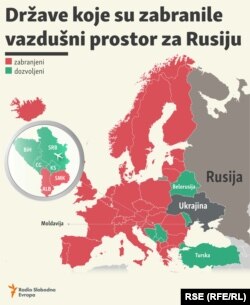 Crna Gora je pokrenula proceduru za donošenje odluke o zatvaranju vazdušnog prostora za ruske avione, dok su Srbija i Bosna i Hercegovina protiv takve odluke.