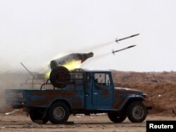 Pobunjenici lansiraju rakete protiv pro-vladinih snaga na frontu duž zapadnog ulaza u grad Ajdžabija, 21. april 2011.