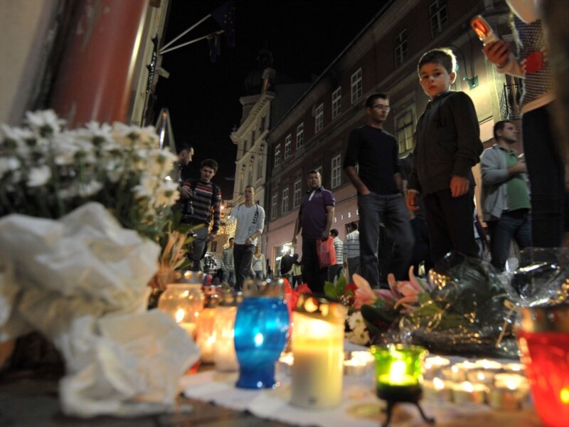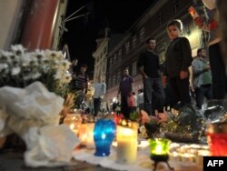 Bosanski dečak gleda u upaljene sveće na pragu norveške ambasade u Sarajevu u znak sećanja na žrtve od 22. jula nakon napada u Oslu, 24. jul 2011.
