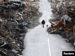 Čovek hoda sa svojim psom između uništenih stambenih objekata u Kesenumi, prefektura Mijagi, 22. mart 2011.
