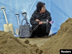 Tokiko Abe, koji je izgubila muža u cunamiju 11. marta, čeka njegov kovčeg da dođe do privremene masovne grobnice u Higaši Matsušima, 22. mart 2011.