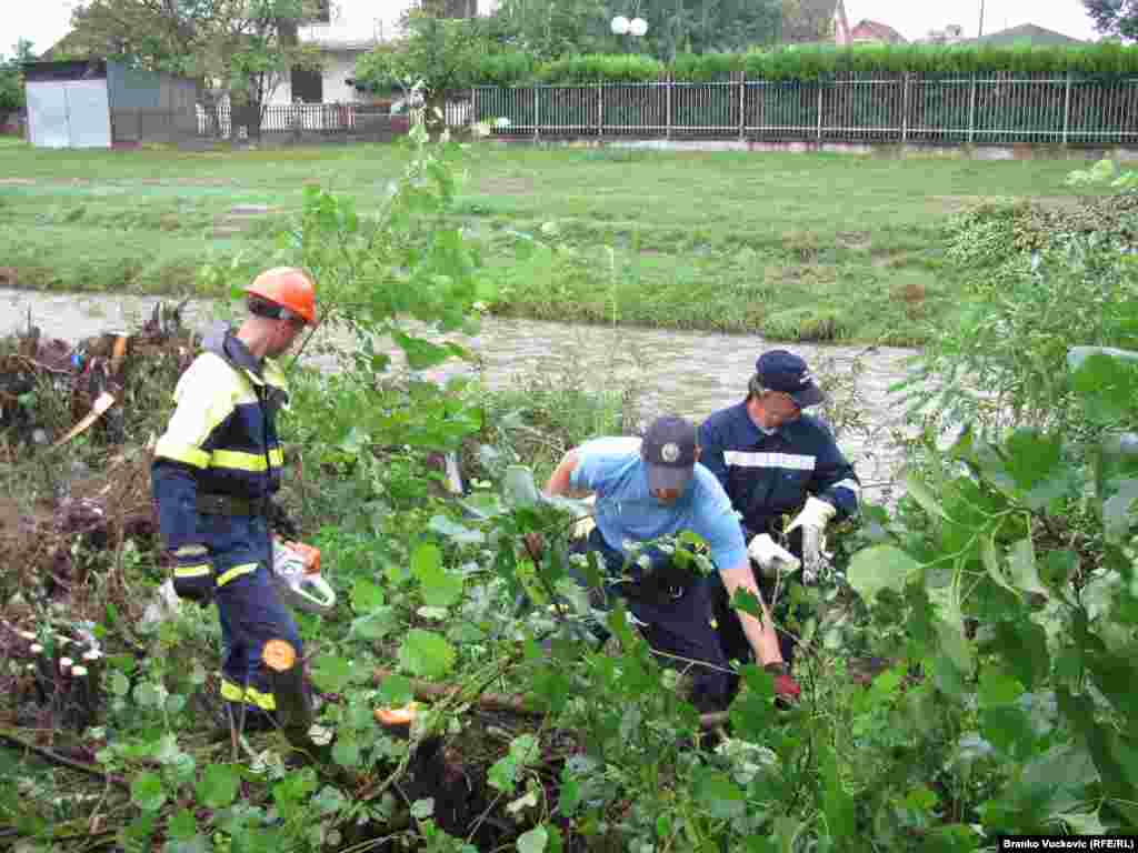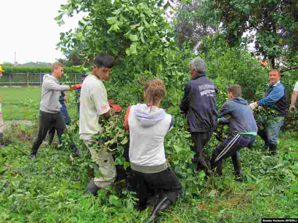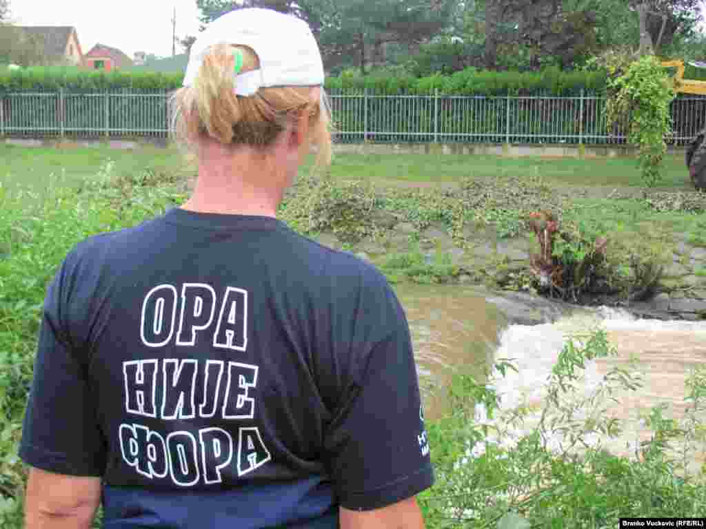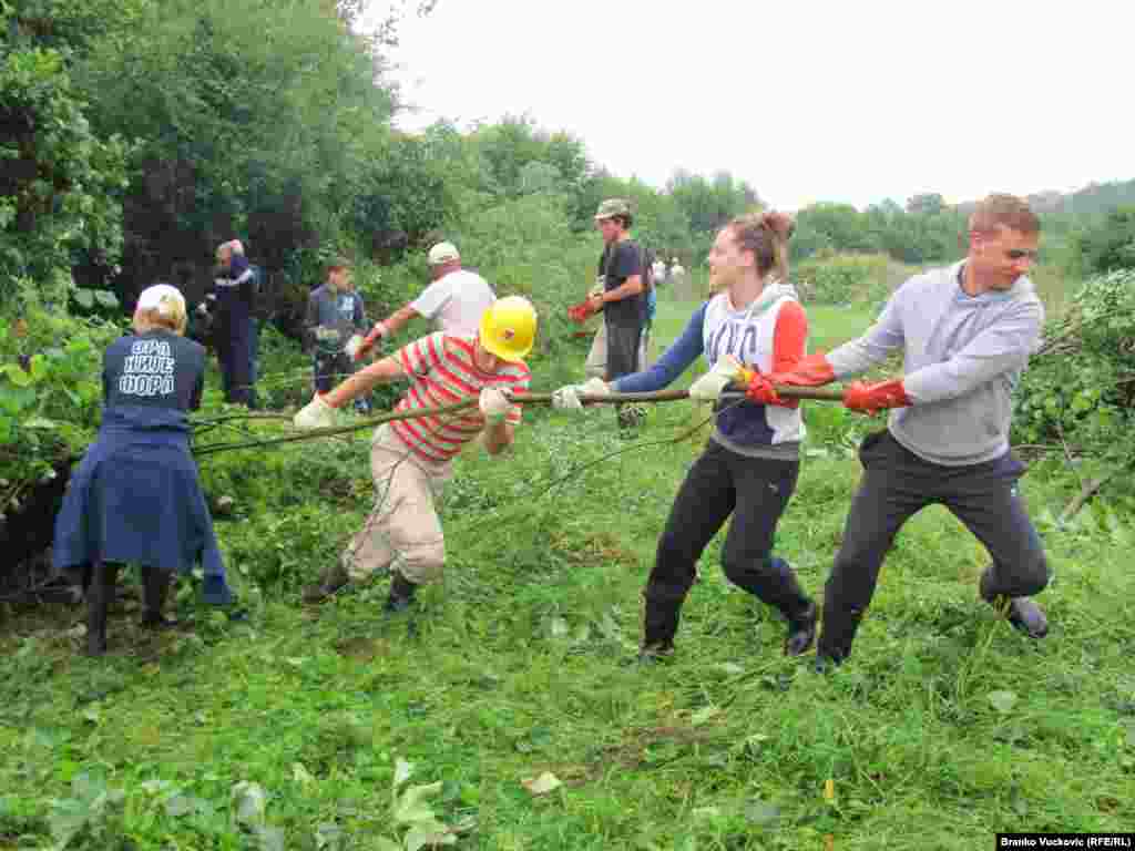 Pedeset akcijaša iz Slovenije, Makedonije i Srbije, kako nekadašnjih, tako i onih iz mlađe generacije, okupili su se kako bi radili na uređenju korita reka, sanaciji oštećenih puteva i pomogli gde bude potrebno. Avgust 2014. RSE foto / Branko Vučković
