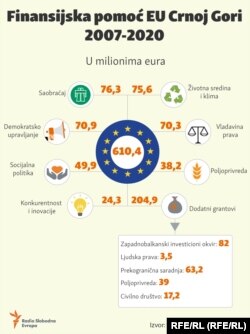 Evropska unija je od 2007. godine donirala Crnoj Gori preko 610 miliona eura finansijske pomoć, za razne oblasti i namjene podaci su Evropske unije u Crnoj Gori.