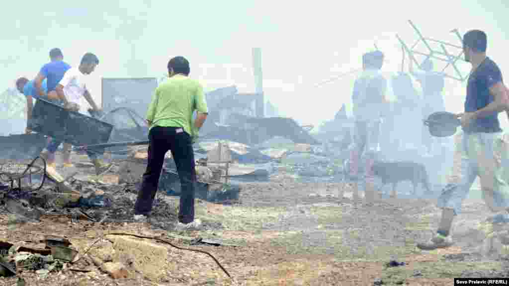 U izbjegličkom kampu u podgoričkom naselju Konik izbio je veliki požar, u kome je izgorio veliki broj baraka namijenjenih za izbjeglice sa Kosova. Foto: RSE / Savo Prelević, 24. juli 2012.
