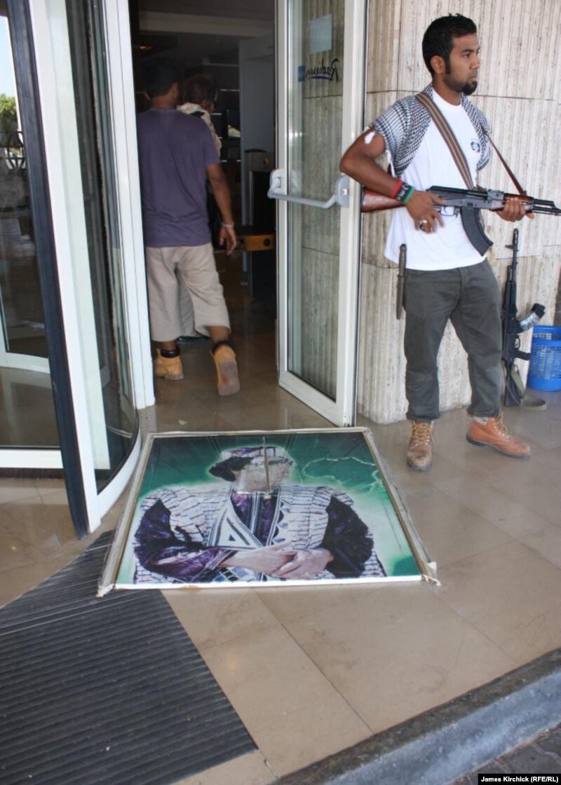 Ulaz u Radisson Hotel u Tripoliju, na ulazu slika Moamera Gadafija koju pobunjenici gaze, Tripoli, 15. avgust 2011.