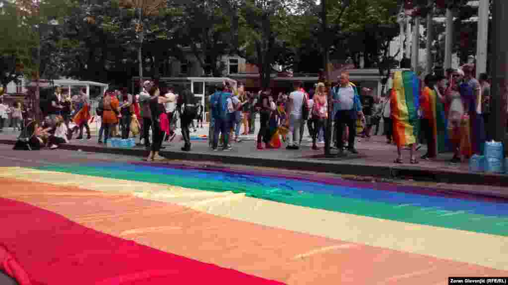 Radnik komunalne službe postavlja zastavicu duginih boja