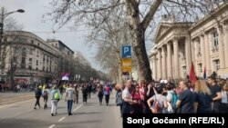 Kolona ljudi tu prolazi i kreće se Bulevarom kralja Aleksandra ka Skupštini Srbije.