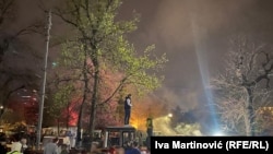 Grupa koja pali baklje skandira protiv predsednika Srbije Aleksandra Vučića i studenata koji kampuju u Pionirskom parku.