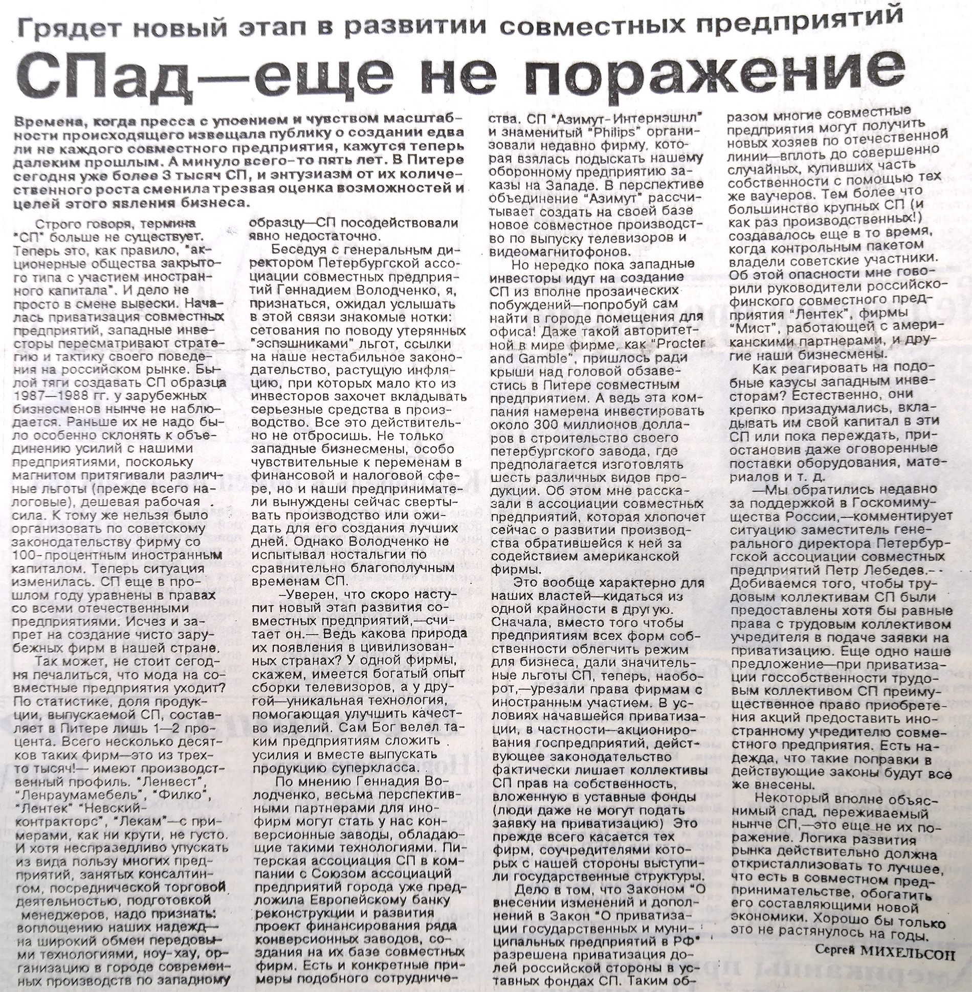 Prema izveštaju Komiteta do kojeg je RSE došao u državnom arhivu, do kraja 1991. u Sankt Peterburgu je registrovano skoro 300 zajedničkih preduzeća. Prosečan strani udeo kretao se oko 60 odsto vlasništva. Već 1993. bilo je više od 3.000 zajedničkih preduzeća, ali su ona i dalje činila manje od dva odsto firmi u gradu, izvestile su lokalne novine Nevskoe vreme.