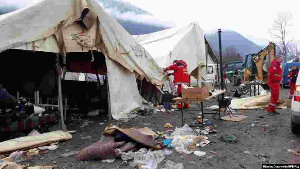 Volonteri gradskog i kantonalnog Crvenog krsta/križa iz Bihaća, od ranih jutarnjih sati 11. decembra raščišćavaju kamp Vučjak nadomak Bihaća u kome su do sinoć bili smješteni migranti. Sklanjaju šatore i drugu opremu, kako bi kamp u potpunosti bio očišćen.