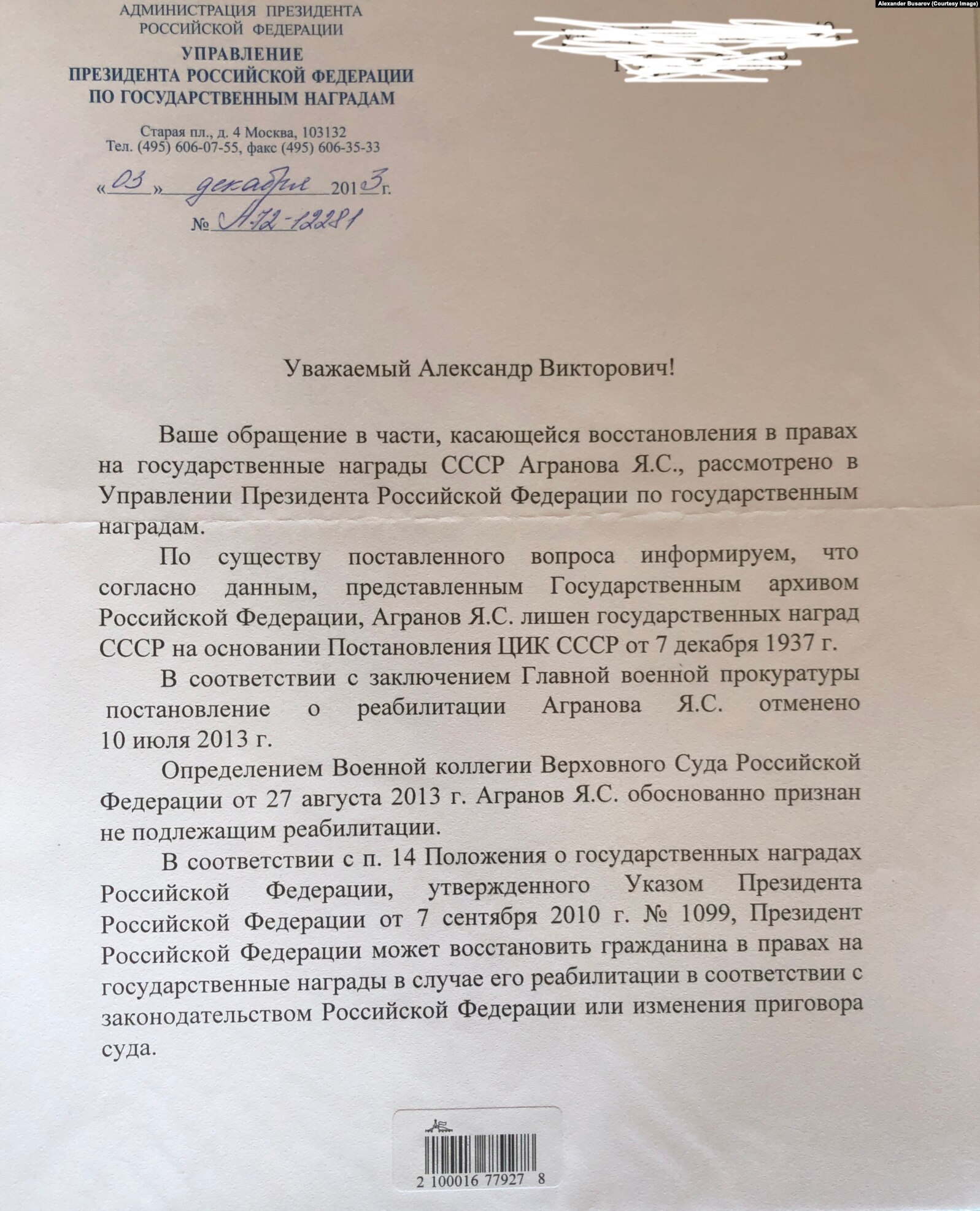 U augustu je ovu odluku potrdio vojni kolegij ruskog Vrhovnog suda. U decembru je Busarov dobio pismo iz Kremlja u kojem stoji da Putin neće vratiti Agranovu državne počasti zbog presude suda.