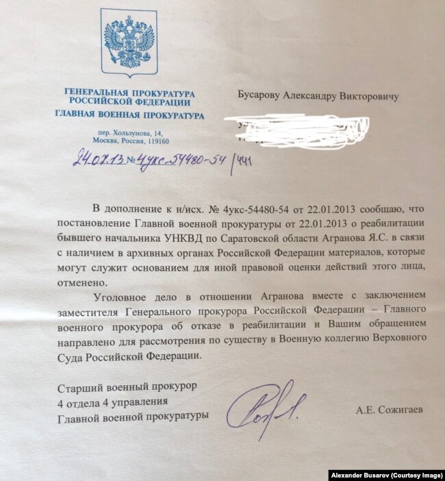 Više od godinu dana, Busarov se dopisivao sa zvaničnicima, predstavljajući dokaze o Agasovim zločinima. Nakon zatvorenog sastanka vojnog kolegija vrhovnog suda od 12. aprila 2016. godine, njegova rehabilitacija je povučena.